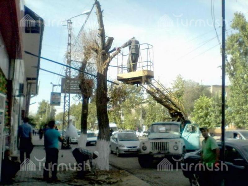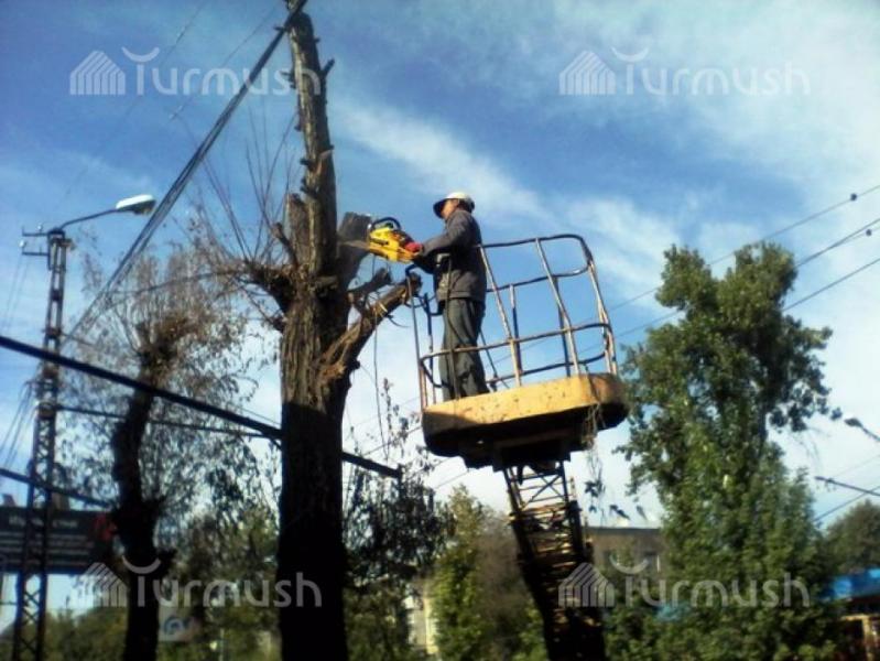 В Оше при проведении обрезки деревьев жители создают опасные ситуации, засматриваясь на работу дровосеков (фото)