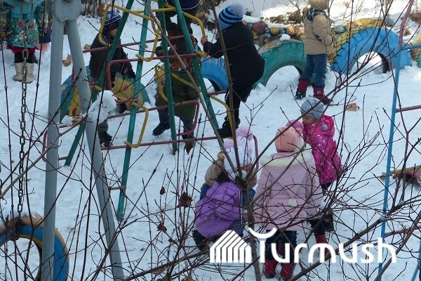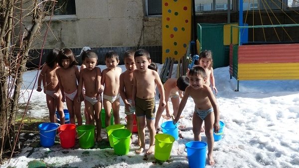 Фото, видео – В Оше дети одного из детсадов в целях оздоровления обливаются водой на открытом воздухе